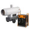 Hochwertiger mobiler Ölheizer mit 58.6 kW Heizleistung und einem Volumenstrom von 2500 m3/h, auch geeignet für Räume wo sich Menschen aufhalten wie Werkstätte, Festräume usw., Anschluss für optionalen Raumthermostat vorhanden, gewährleistet einen garantierten und störungsfreien Betrieb